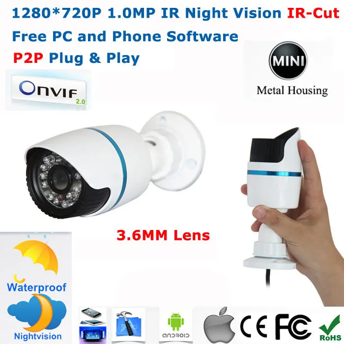 Main Features : 720P Mini Bullet 1280*720 1.0MP IP Camera ONVIF 2.0 IP66 Waterproof Outdoor IR CUT Night Vision P2P Plug and Play+12V power