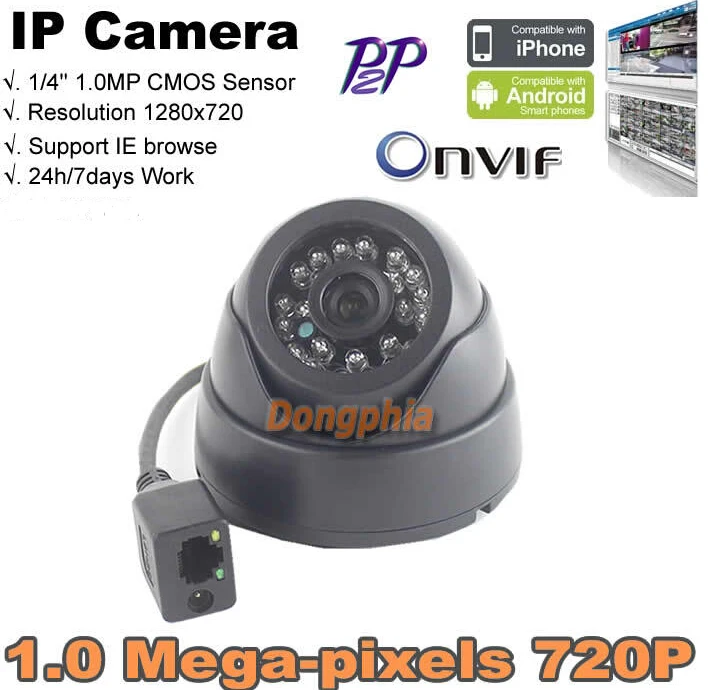 Main Features : H.264 ONVIF 720P Wired IP Camera 24 units Infrared LEDs Dome Plastic black dome IP Camera P2P network monitoring 1.0 Megapixel